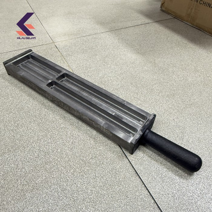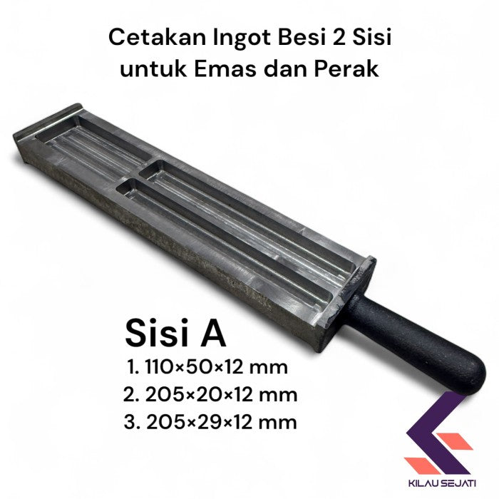 Cetakan ingot besi dua sisi ini dirancang khusus untuk peleburan logam mulia seperti emas dan perak. Memiliki total 8 jalur cetakan dengan berbagai ukuran yang dapat memenuhi kebutuhan produksi dari yang kecil hingga sedang. Terbuat dari besi cor tebal dan tahan panas, cetakan ini memberikan hasil akhir batangan yang presisi dan mudah dilepas. Ideal untuk pengrajin perhiasan, peleburan logam, dan industri kecil.